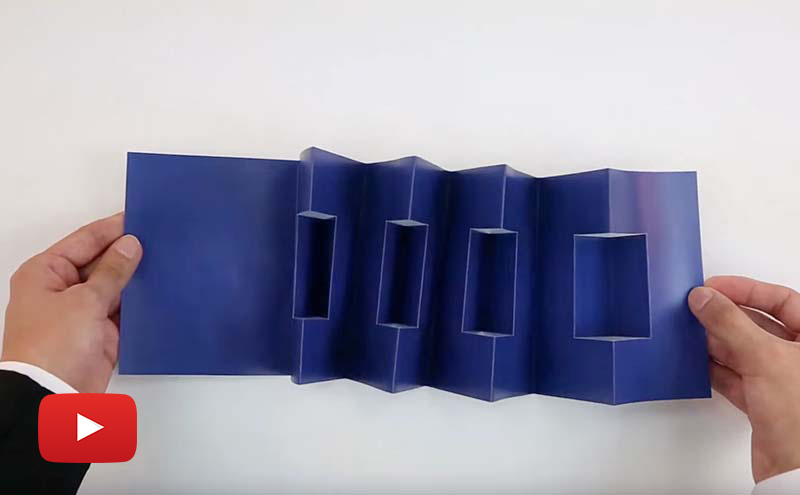 The nine panel pop out accordion holiday design is a fascinating and dimensional format. That expands and surprise is the recipient. The four pop out boxes, create a focal point for a message, a date, some photos, or pops of color. For the holidays, or a save the date card, celebrate with each box featuring a number (ex 2-0-2-4).