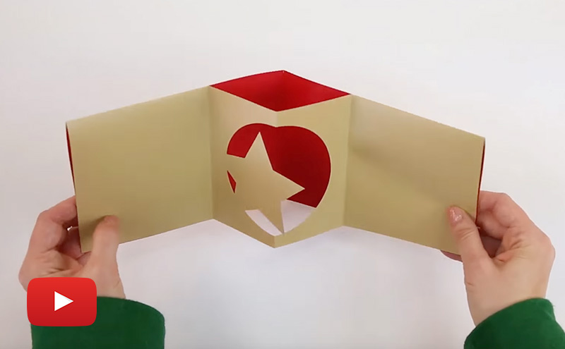 The snowflake locked gate, takes the classic gate fold format and embellishes it with a holiday-themed locking mechanism in the shape of a snowflake. The snowflake is dimensional, and the locking cover makes the format really fun to open. If snow isn’t the theme you’re looking for, consider a locking star, locking tree, or a locking circle.