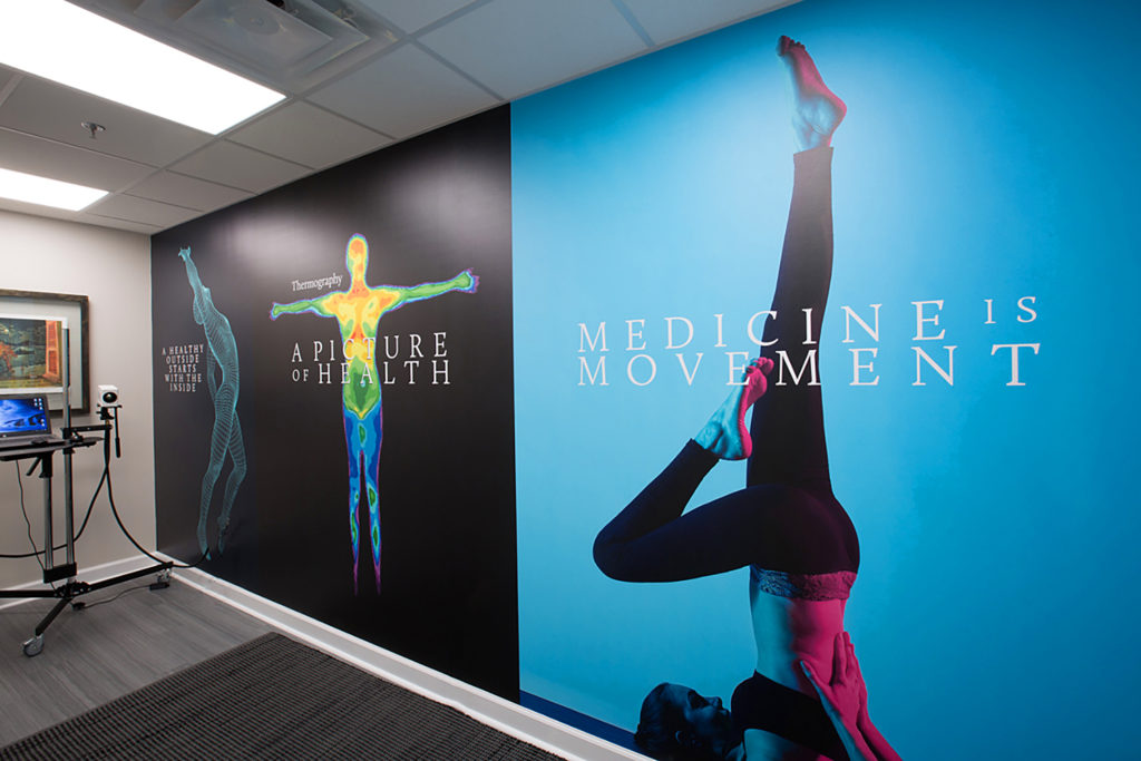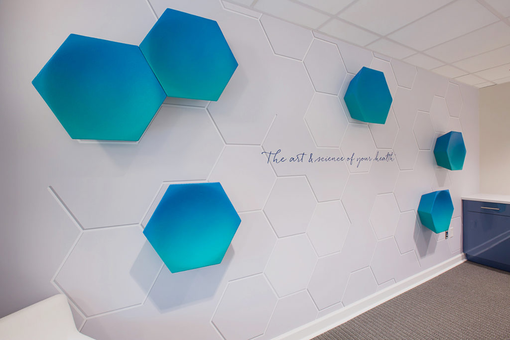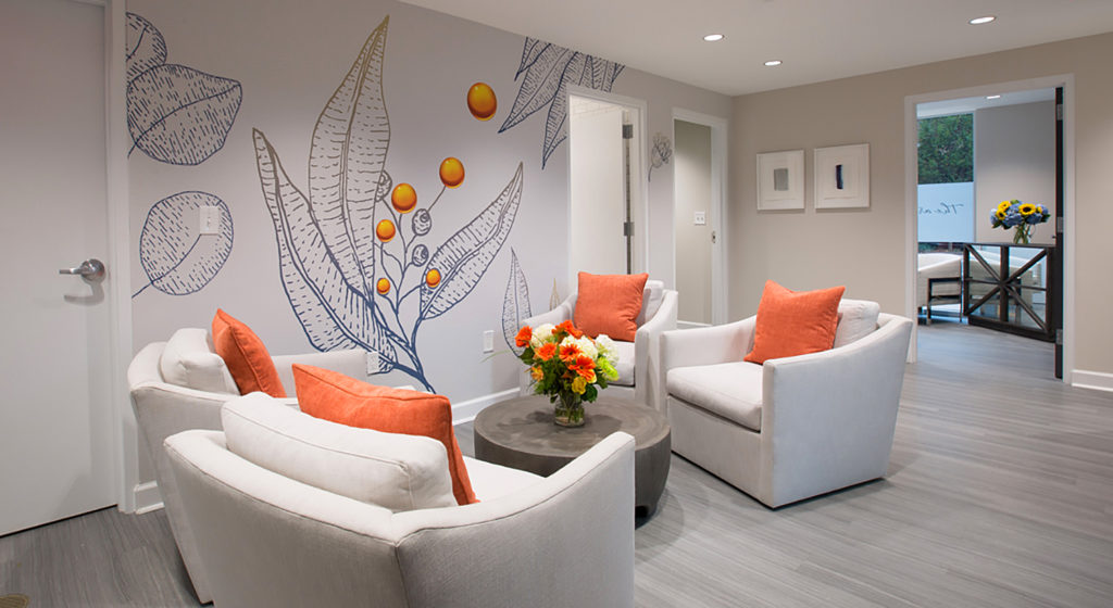 No, we can’t produce and install a mural for you while you wait in our lobby, but we learned recently that we can do it pretty fast. Wallace Graphics was asked by the Whitehouse agency to produce a set of custom digital print wallpaper murals based on their creative concept for the Lile Wellness Partners Alpharetta, Georgia location.