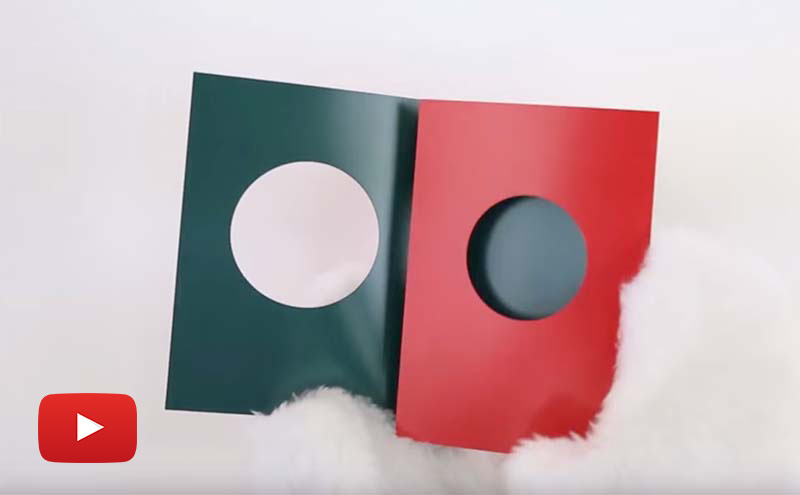 The tri-fold with layered circle die-cut holiday format adds a lot of pizzazz to the classic tri-fold, while leaving penty of opportunity for creative expression. When closed, the circles layer together for a dimensional cover and a center focal point for a holiday image or message. Inside, there’s plenty of room for everyone to sign.