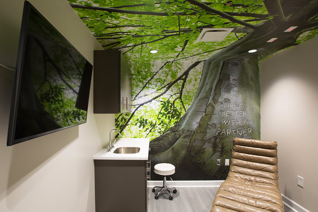 The project presented several challenges. The first being a time frame of 48 hours for the production and installation of the custom digital wallpaper prior to the grand opening of the new location. Next, the offices for Lile Wellness were still under construction, and one of the custom wallpaper murals continued on from the wall and onto the ceiling.